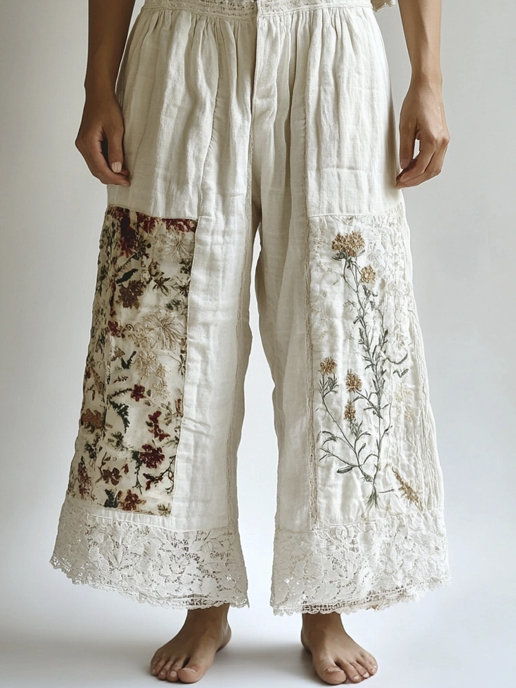 Lace Floral Embroidery Patchwork Women's Linen Pants
