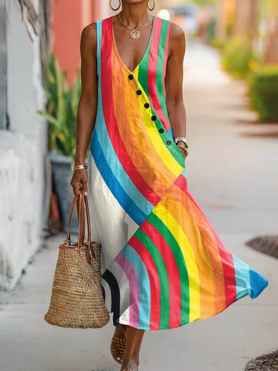 Women's Abstract Art Print Button Sleeveless V-neck Dress