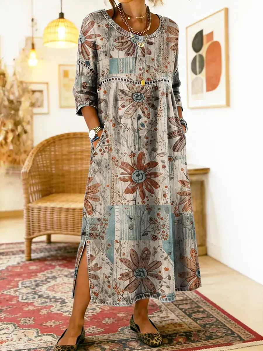 Women's Bohemian-style Floral Art Print Cotton Denim Dress With Lace Trim