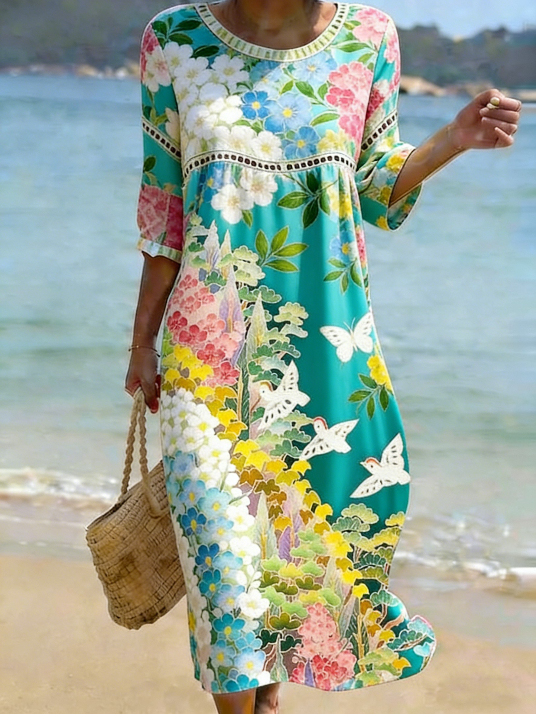 Women's Chinese Style Print Crew Neck Cotton Pocket Dress