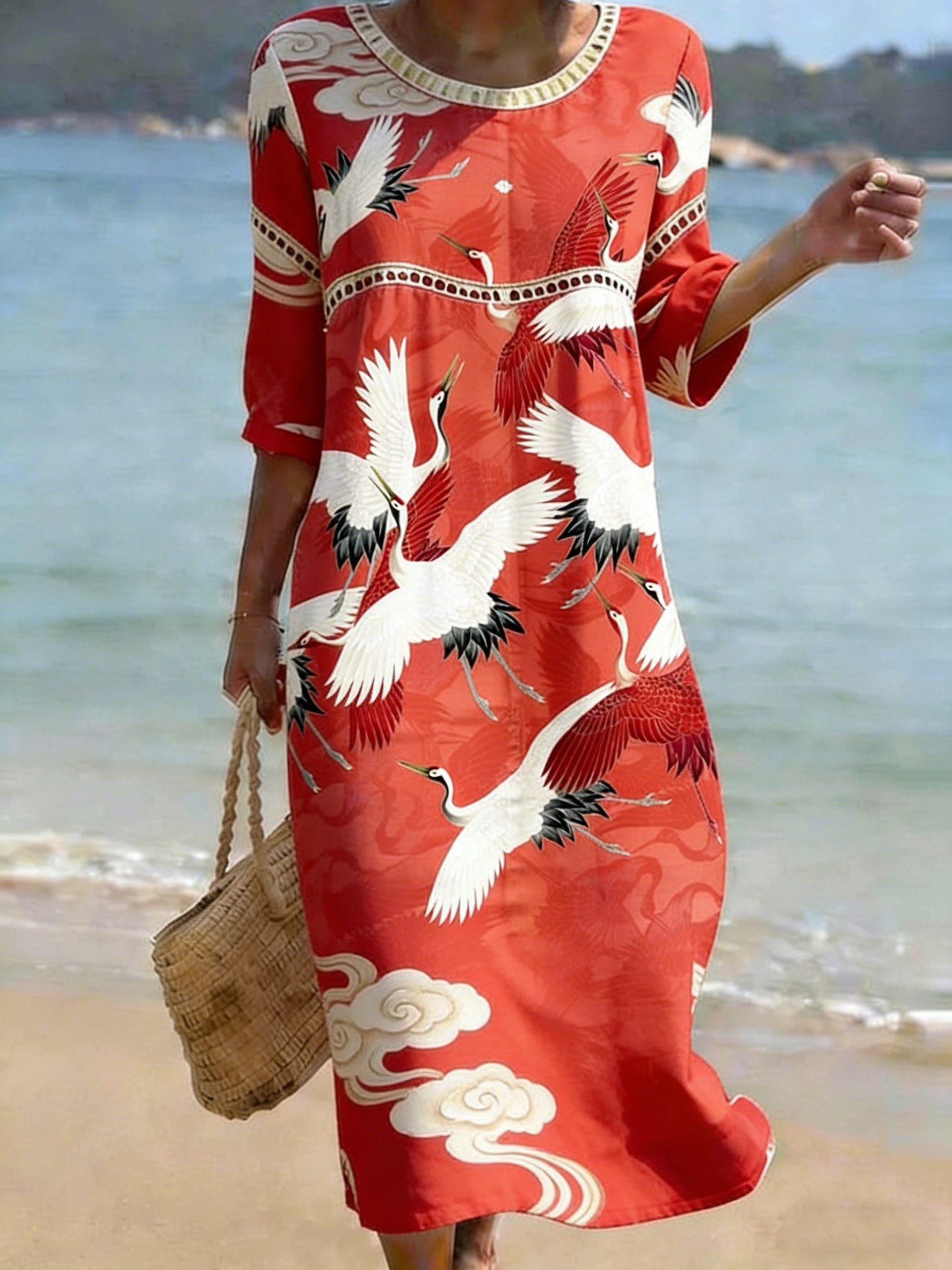 Women's Chinese Style Print Crew Neck Cotton Pocket Dress