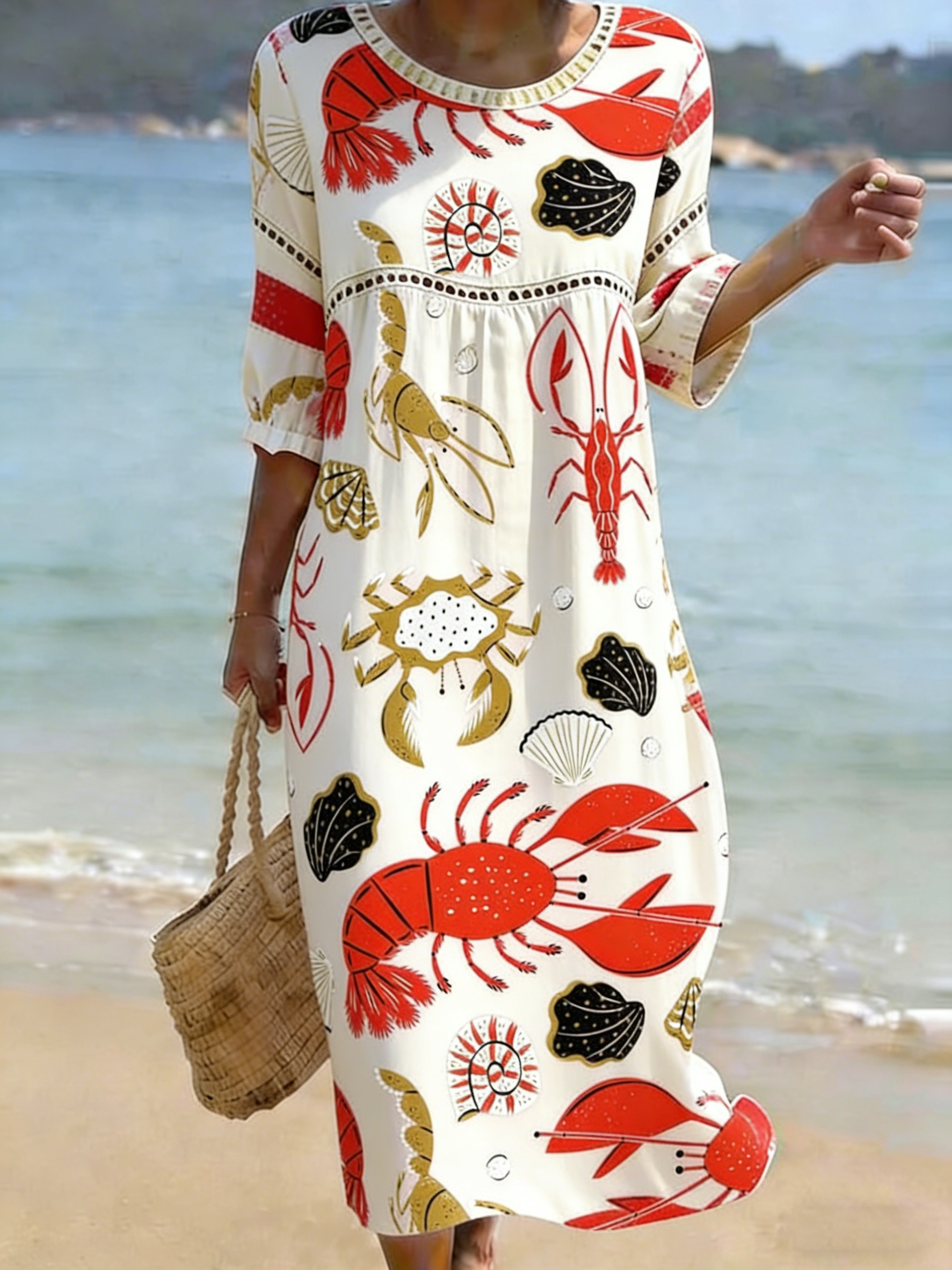 Women's Folk Pattern Printed Crew Neck Cotton and Linen Dress