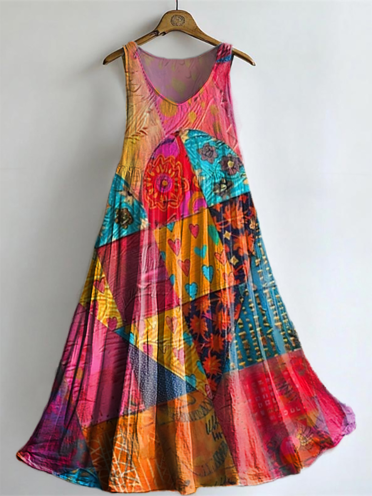 Women's Colorful Heart Floral Patchwork Art Pattern Print Sleeveless Cotton Pocket Dress