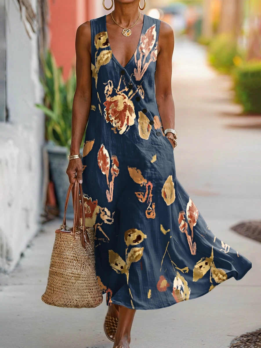 Women's Fashionable Elegant Flowers Print Button Sleeveless V-neck Dress