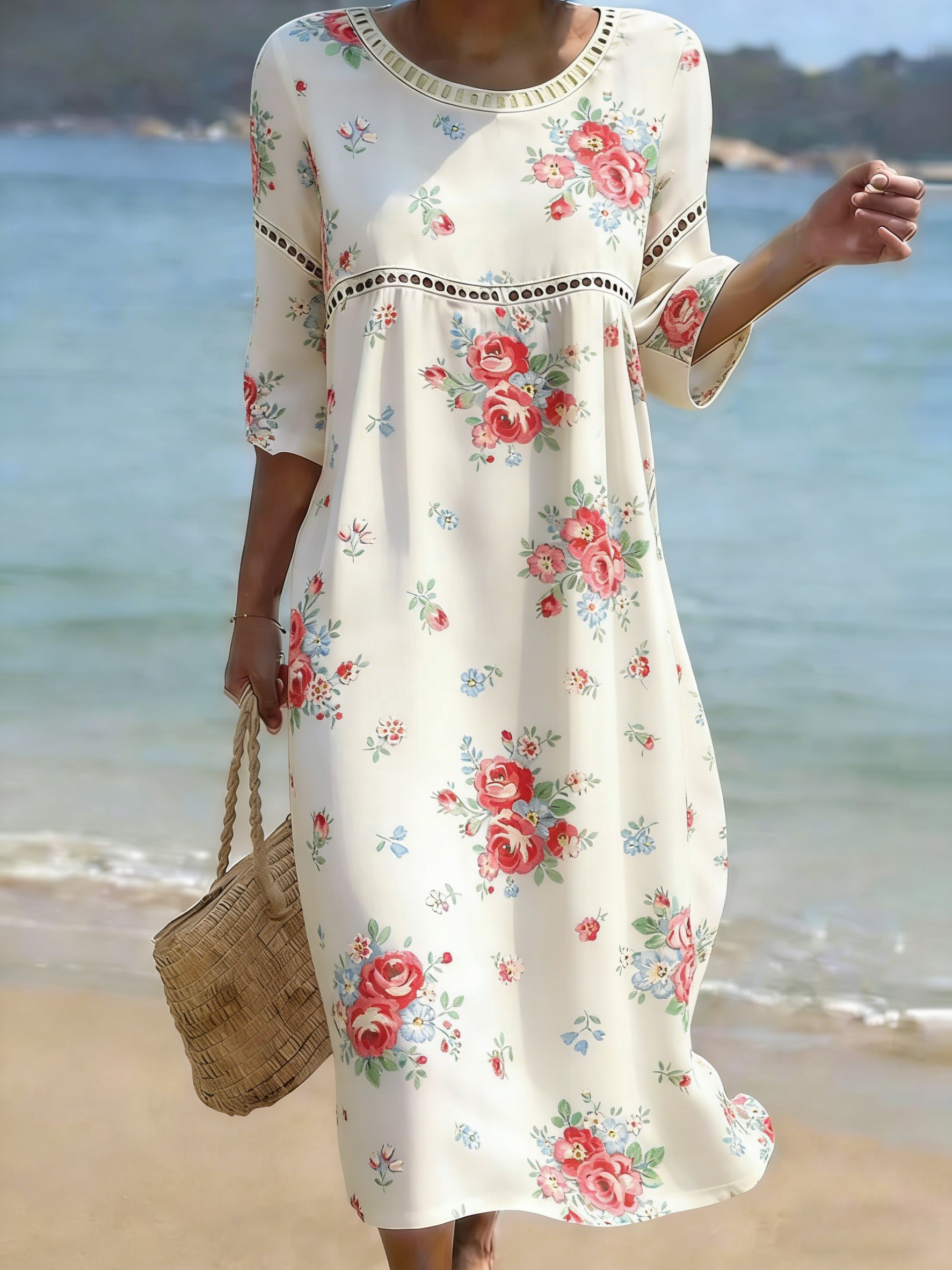 Women's Folk Flowers Print Crew Neck Cotton Pocket Dress