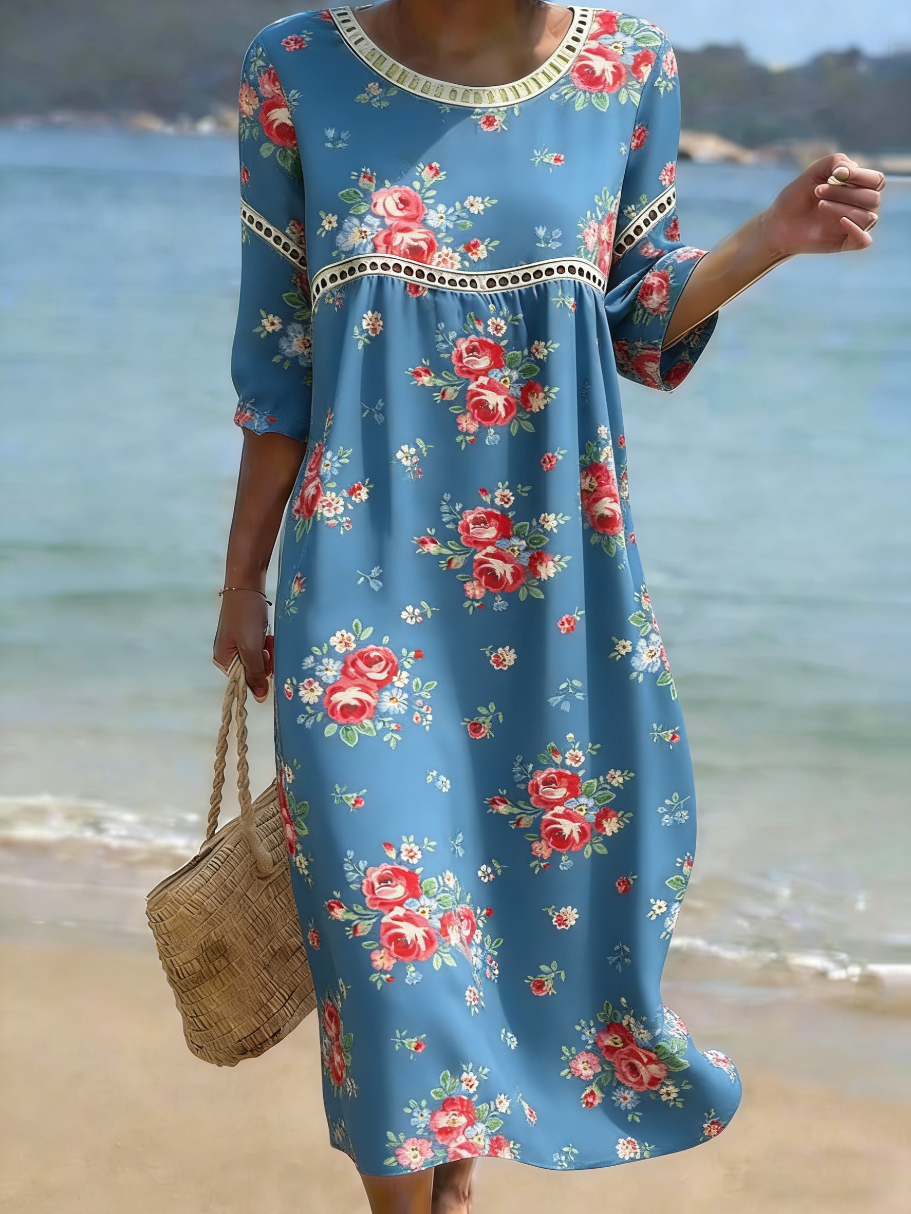 Women's Folk Flowers Print Crew Neck Cotton Pocket Dress