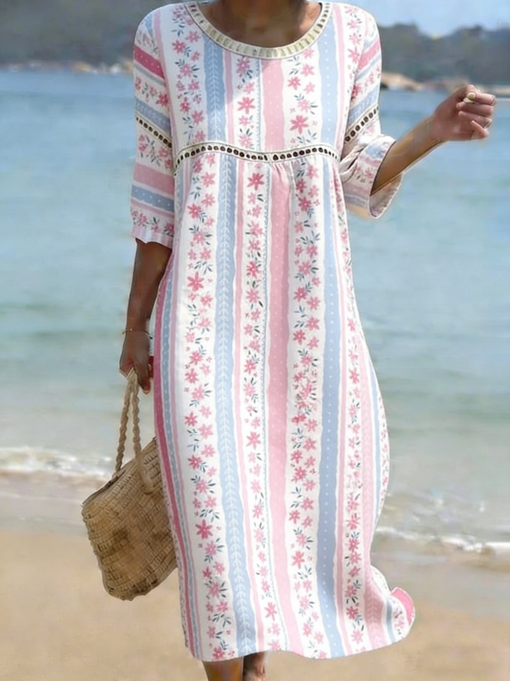 Women's Folk Flowers Print Crew Neck Cotton Pocket Dress