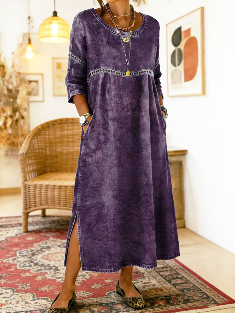Women's Retro Ethnic Floral Art Print Casual Round Neck Hollow-out Washed Cotton Denim Dress