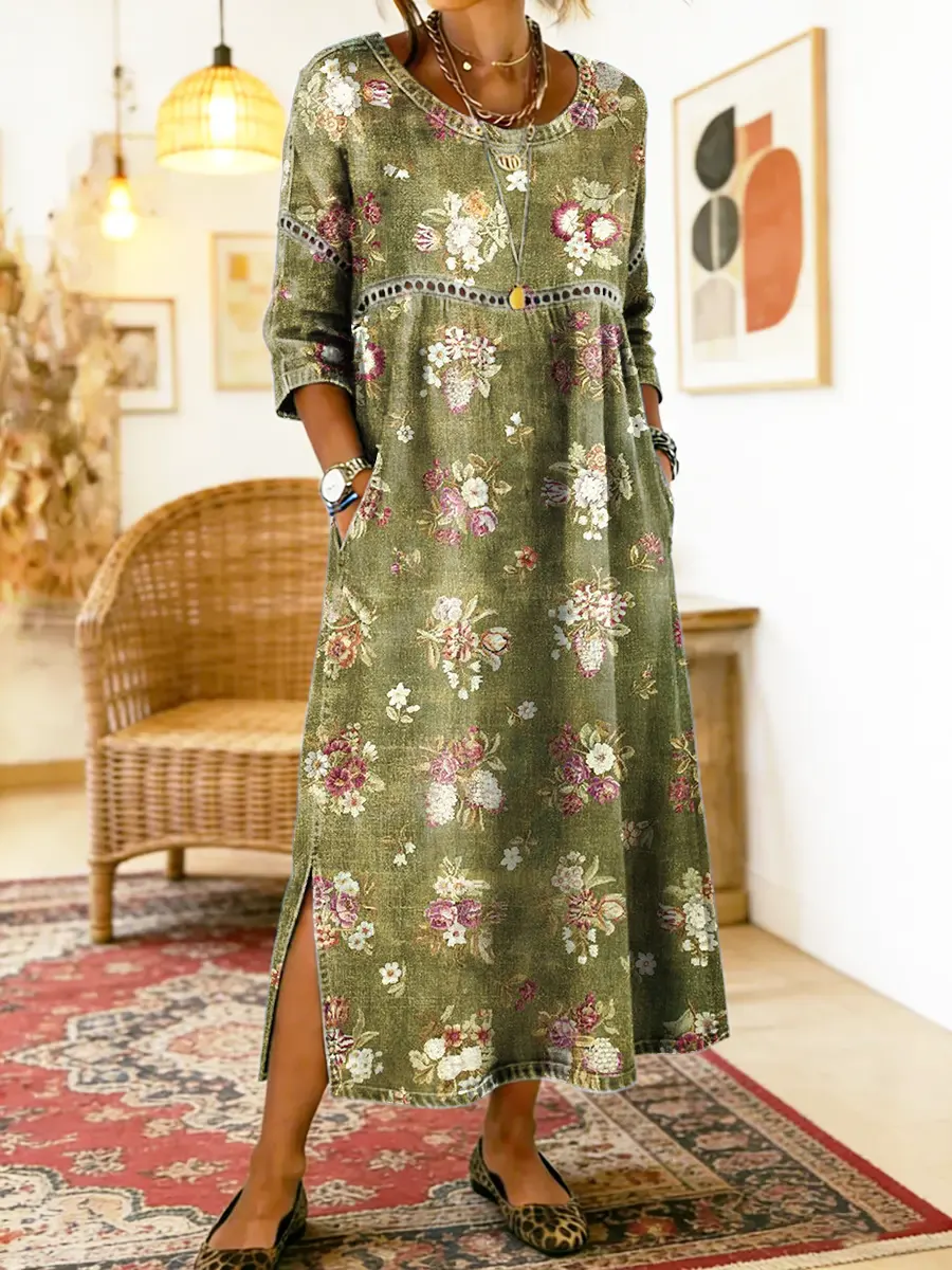 Women's Retro Floral Art Print Cotton Denim Dress With Lace Trim