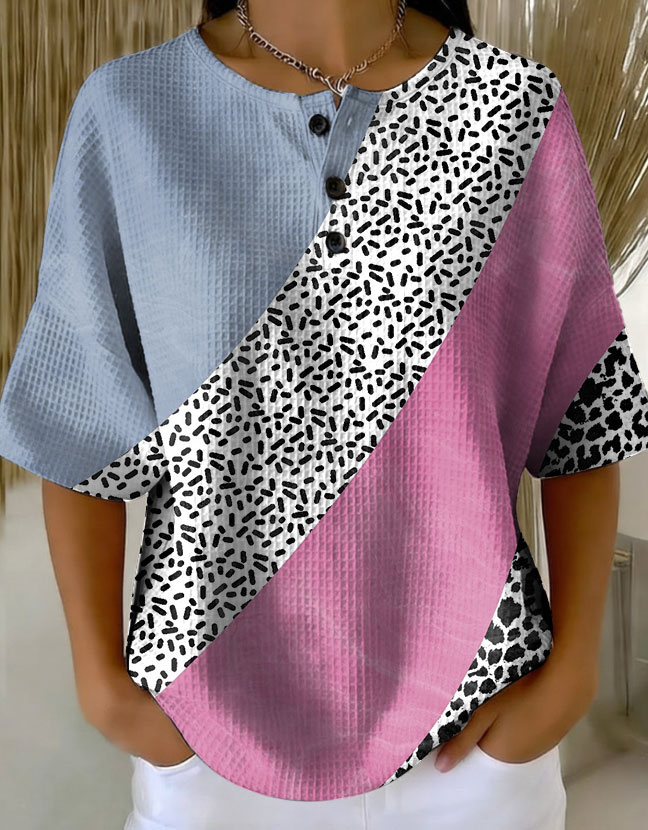 Women's Retro Geometric Patchwork Abstraction Patterns Art Print Casual Waffle Cotton Shirt