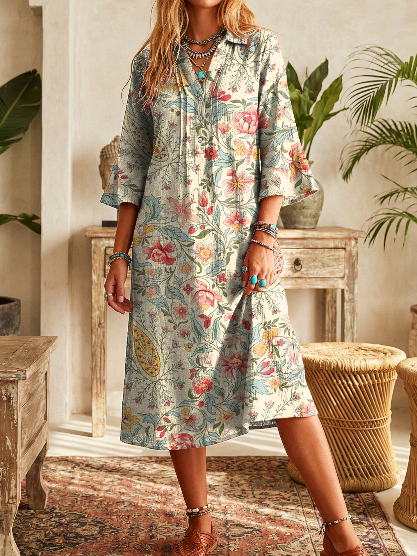 Women's Vintage Ethnic Paisley Floral Art Printed Casual Lapel Ruffles Button Dresses