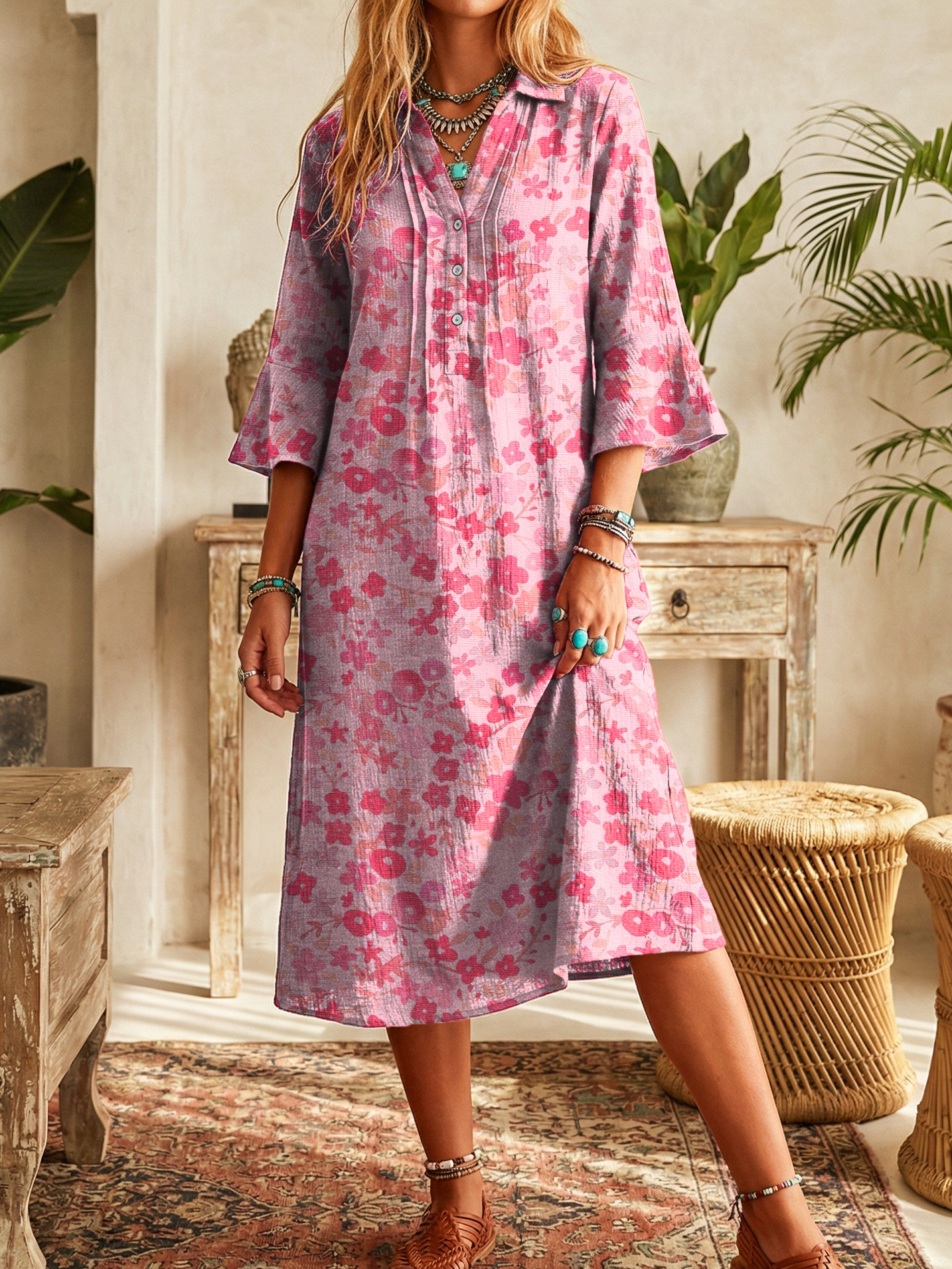 Women's Vintage Ethnic Pink Floral Art Printed Casual Flap Neck Pleated Button Dresses