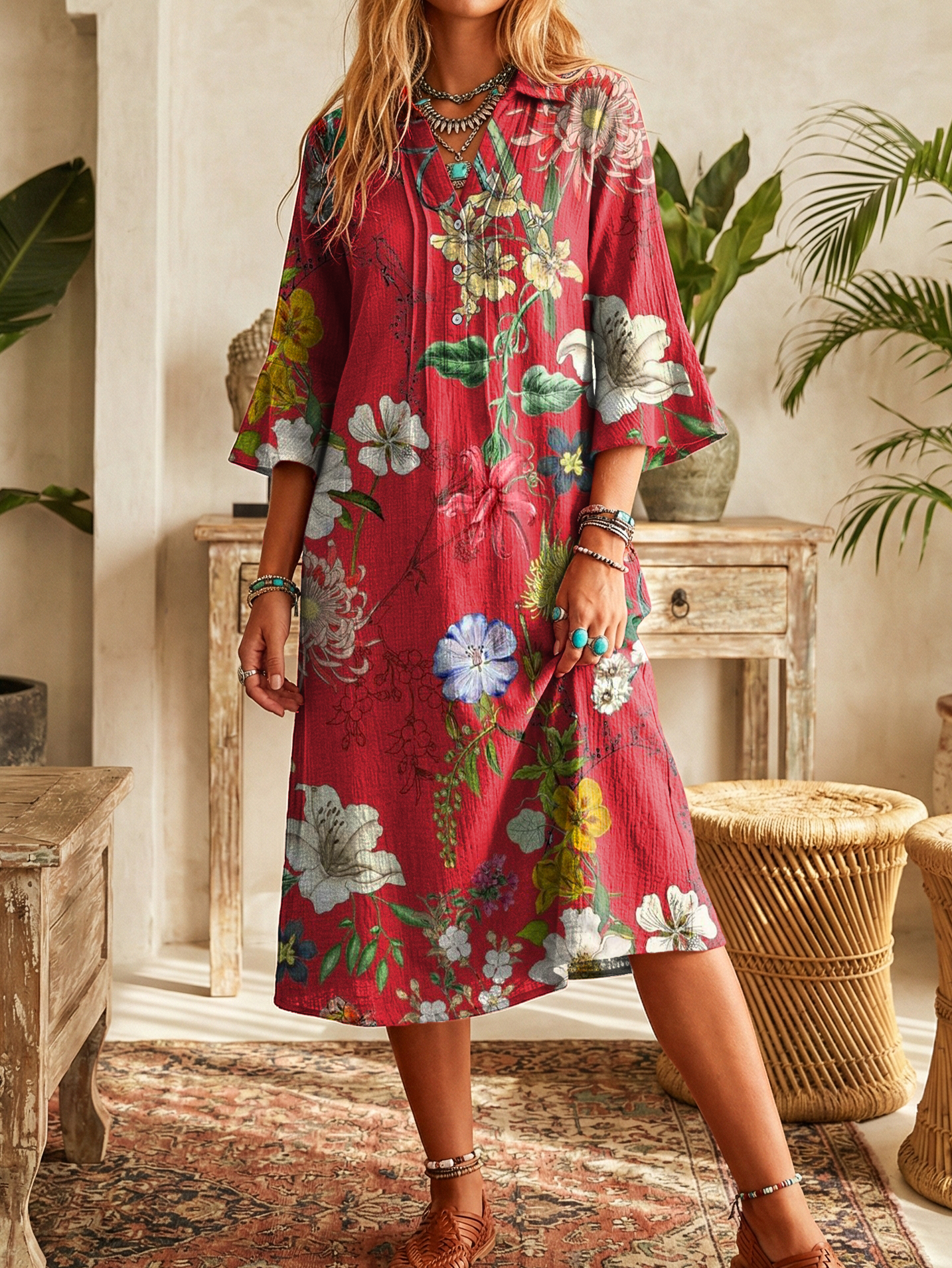Women's Vintage Ethnic Red Floral Art Prints Casual Flap Neck Pleated Button Dresses
