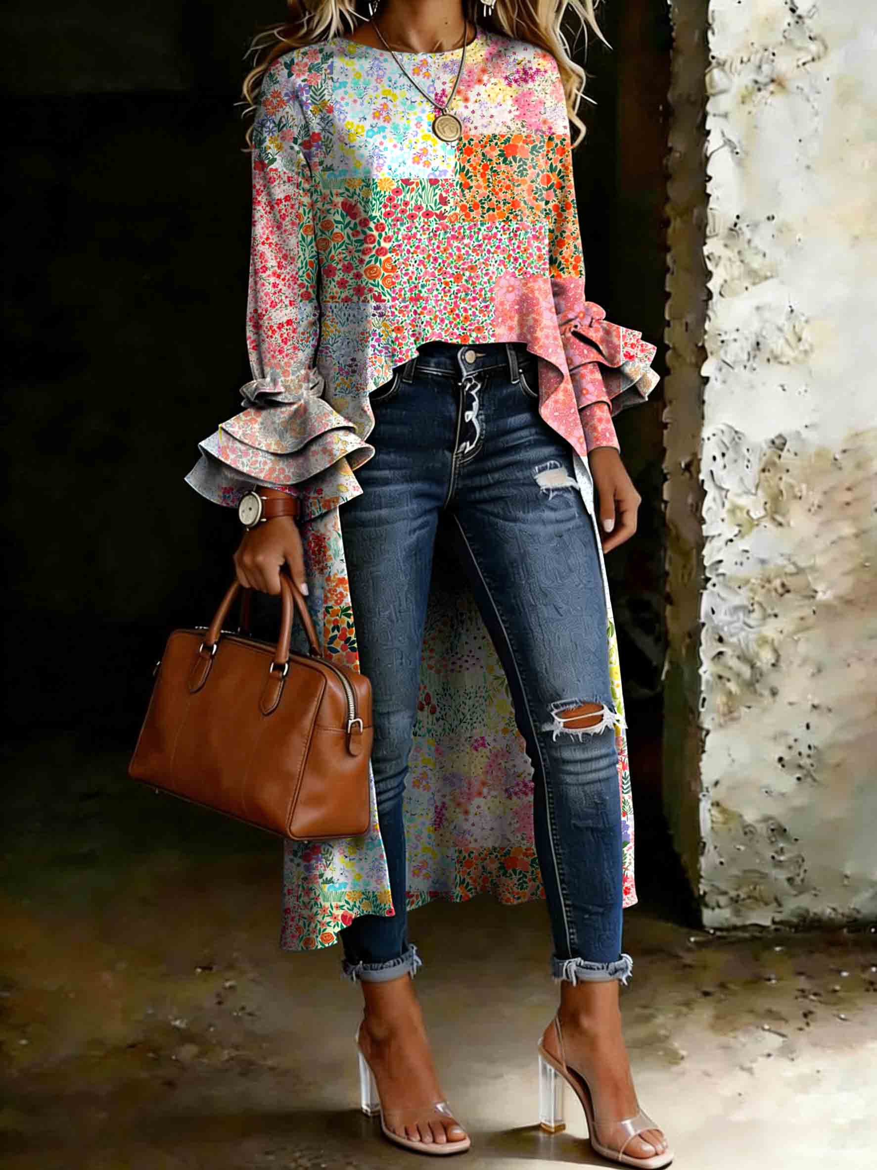 Women's Vintage Floral Patchwork Art Print Casual Ruffles Cotton Shirt