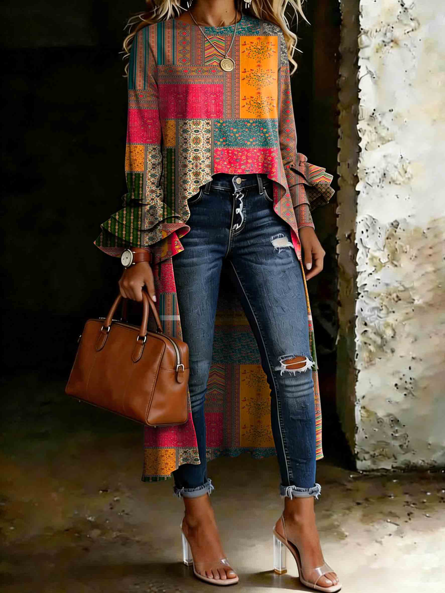 Women's Vintage Floral Patchwork Art Print Casual Ruffles Cotton Shirt