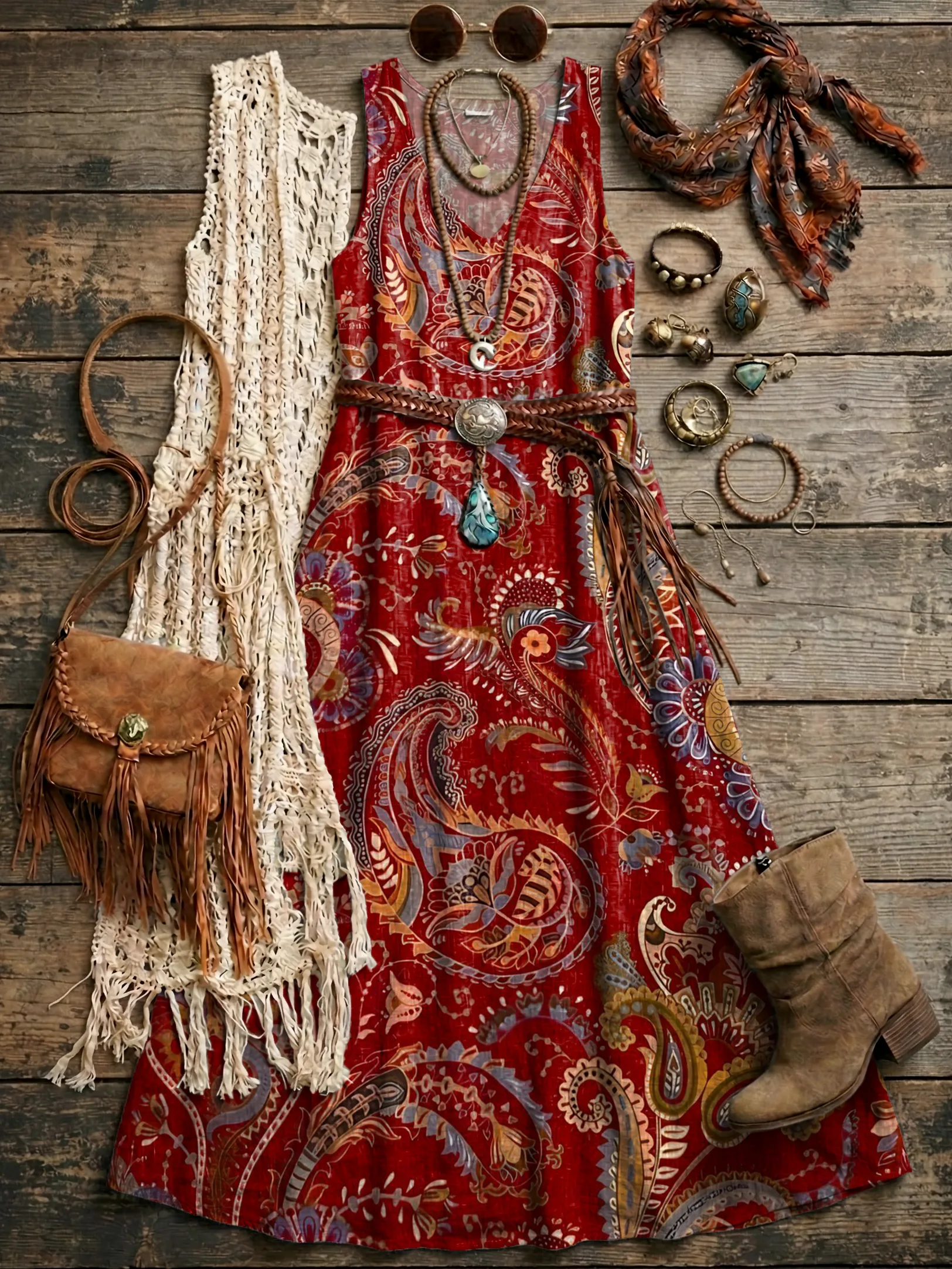 Women's Vintage Red Paisley Floral Art Printed Casual Bohemian V-neck Sleeveless Dresses